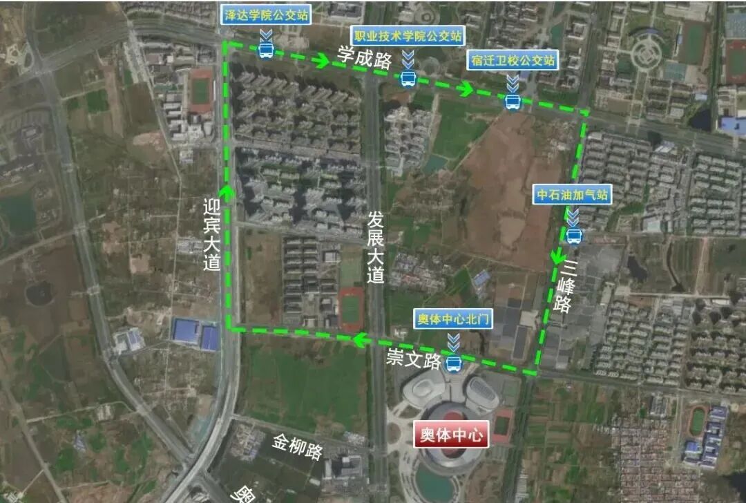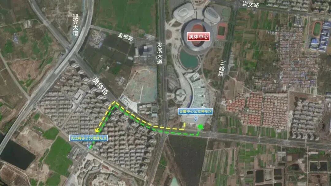 学成路停车区—奥体中心(循环摆渡):迎宾大道——学成路——三峰路——崇文路(奥体北门)